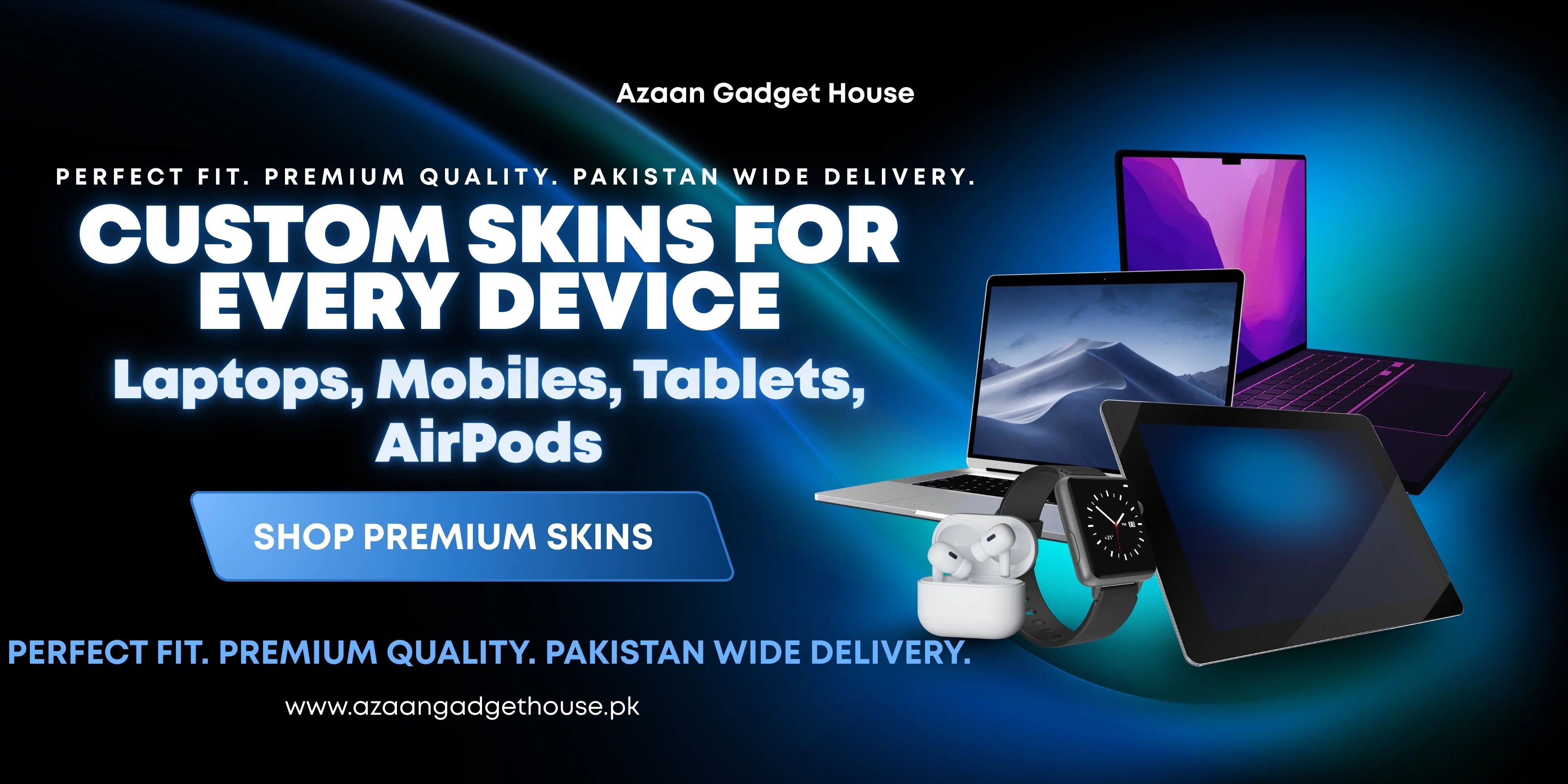Azaan Gadget House specializes in premium custom skins for laptops, mobiles, tablets, and AirPods. Our skins are designed with high-quality materials that offer a perfect fit and long-lasting protection. Every design is crafted to enhance your device with a clean, stylish, and personalized look.