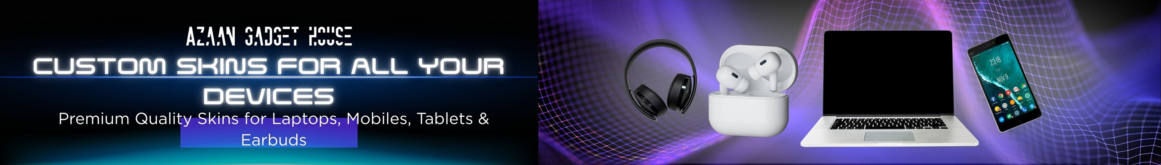 Azaan Gadget House specializes in premium custom skins for laptops, mobiles, tablets, and AirPods. Our skins are designed with high-quality materials that offer a perfect fit and long-lasting protection. Every design is crafted to enhance your device with a clean, stylish, and personalized look.